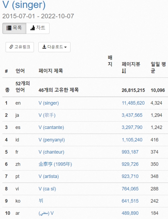 뷔는 2022년 올해 상반기 K팝 개인 최다 페이지뷰 기록은 물론, 위키피디아가 서비스되기 시작한 2015년 7월부터 2022년 10월까지 위키피디아 전기간 세계 누적 페이지뷰 2681만 5215만 건으로 K팝 스타 중 최고 뷰수를 자랑한다