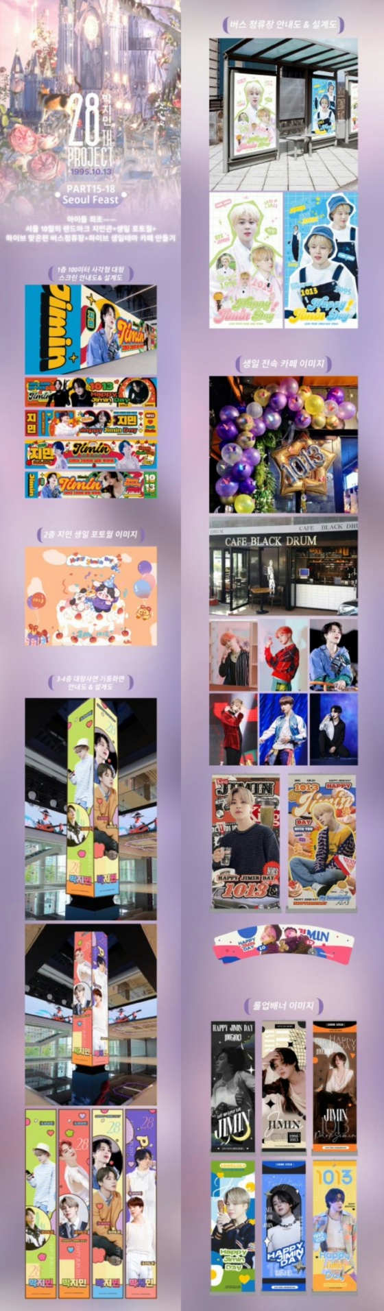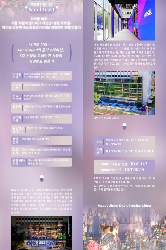 지민의 중국 팬 베이스 '지민바차이나'는 새롭게 떠오른 서울의 대표적인 랜드마크 한국관광 홍보관 하이커 그라운드(HiKR Ground)에 지민의 생일 당일 10월 13일부터 15일까지 생일 프로젝트 'Seoul Feast'를 진행한다.