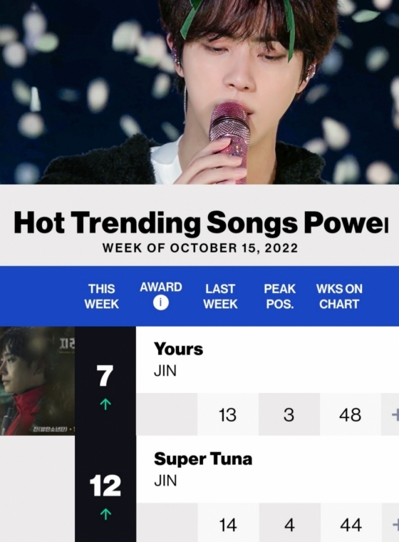 진의 첫 솔로 OST 'Yours'는 '핫 트렌딩 송 주간 차트'에서 여섯 계단을 상승하며 7위를 차지했다.