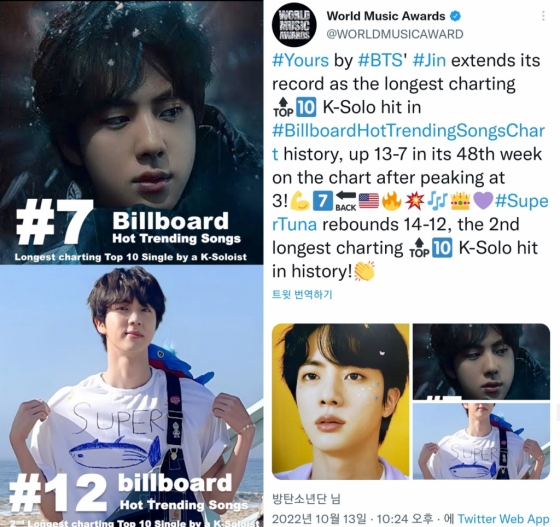 이에 '월드 뮤직 어워드'(World Music Award) SNS 공식 계정은 진의 빌보드 트렌딩 송즈 주간 차트의 신기록 자체 경신 소식을 상세히 전하며 찬사를 보냈다.
