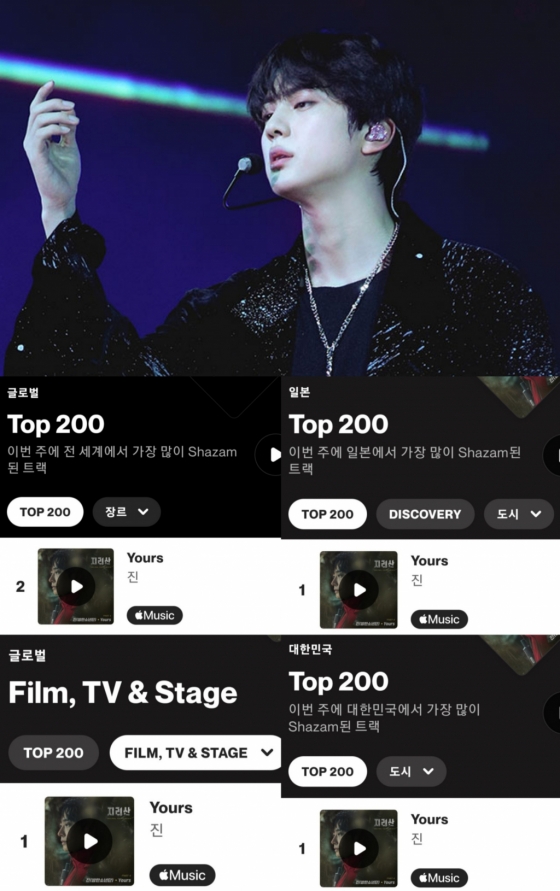 세계 최대 음원 검색 플랫폼 '샤잠'(Shazam) '글로벌 TOP200' 차트에서 'K팝 최초·최장' 102일 1위의 기록을 세운 진의 'Yours'는 13일 기준 2위에 랭크되며, 142일 연속 '톱2', 153일 연속 '톱10'을 기록해 '글로벌 샤잠킹'의 저력을 보여줬다.
