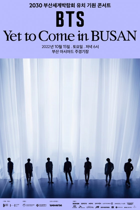 2030 세계박람회의 부산 유치를 염원하는 마음을 담아 무료로 개최되는 이번 'BTS -Yet To Come- in BUSAN'은 방탄소년단의 대표곡으로 구성된 세트리스트 등 전 세계인이 하나 돼 즐길 수 있는 무대로 꾸며진다.