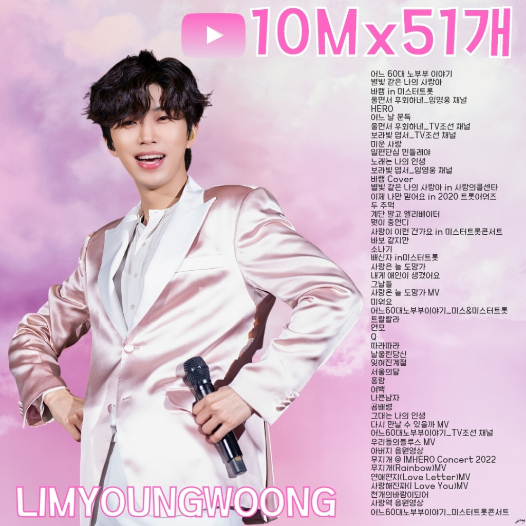 가수 임영웅이 천만뷰 영상 51개를 달성하며 눈부신 영웅신화를 이어갔다.