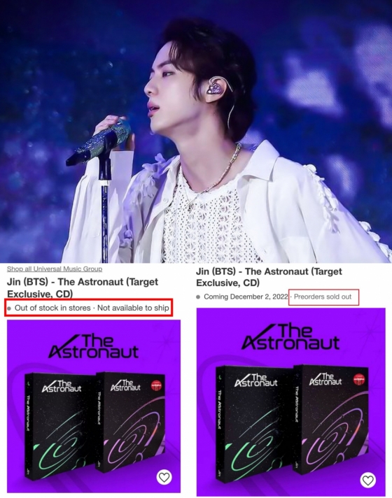 이에 19일 진의 'The Astronaut' 선예약 주문과 함께 미국의 거대 유통 체인 타깃(Target) 온라인 사이트에서는 진 싱글 앨범이 빠르게 품절됐다. 많은 문의 속 재오픈이 열렸지만 또다시 품절로 이어지며 진의 막강한 글로벌 인기를 입증했다.