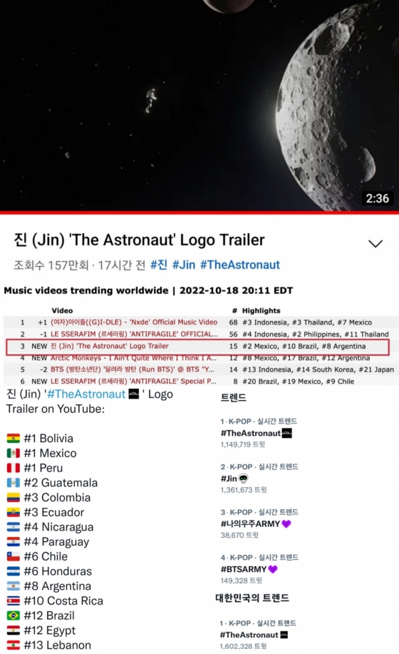 또한 'The Astronaut' 로고 트레일러는 공개 17시간만에 조회수 157만회를 돌파, 15개국에 트렌딩되며 '유튜브 전세계 인기 뮤직비디오' 3위에 올랐다.