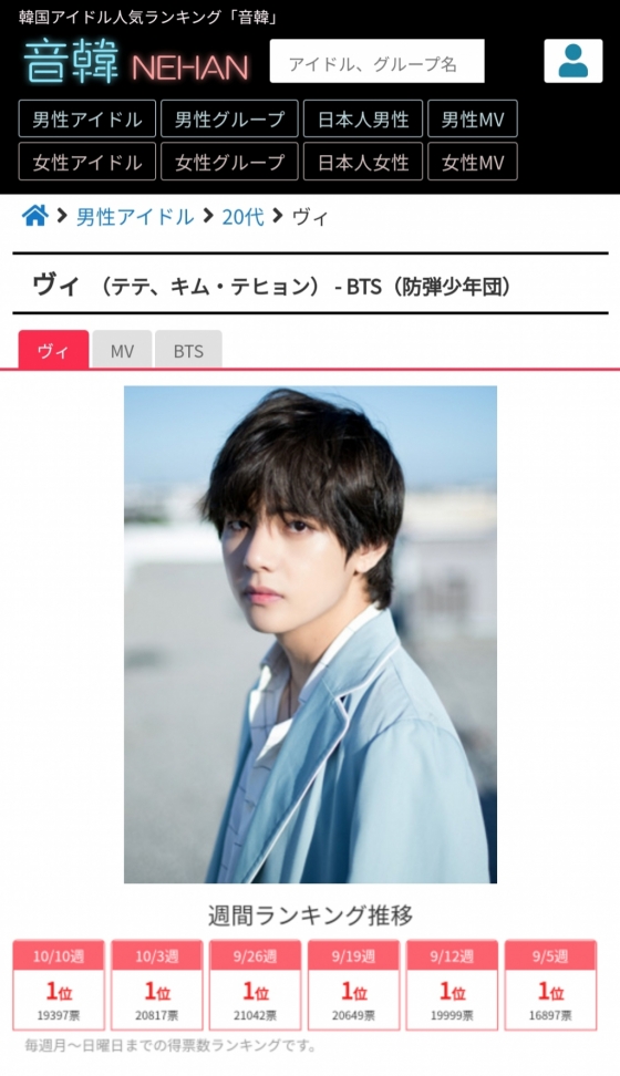 뷔는 10월 10일부터 16일까지 일본 인기 아이돌 랭킹 사이트 '네한(音韓)'의 'K팝 남자 아이돌 랭킹' 투표에서 1만 9397표를 획득, 1위에 올랐다. 뷔는 81주 연속 1위를 차지하며 독보적인 인기를 보여줬다.