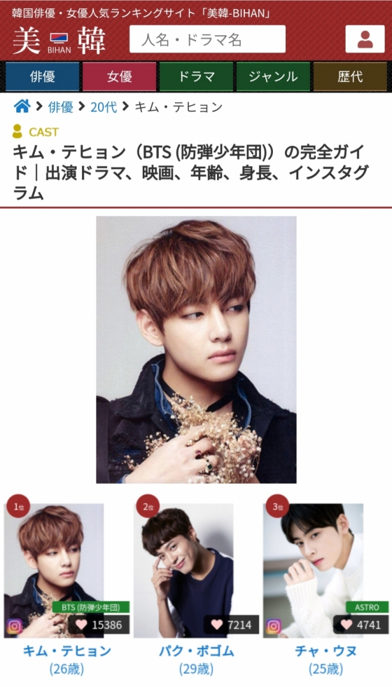 뷔는 같은 주간 '비한(美韓)'에서 진행한 '20대 한국 배우' 부문 투표에서도 1만 5386표를 획득, 77주 연속 1위를 차지하며 연기자로서 기대감도 입증했다.