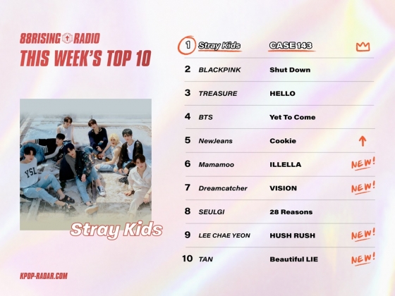 케이팝 전용 차트 프로그램 '케이팝레이더'는 21일 케이팝레이더 위클리 팬덤 차트를 발표했다. 이번 차트에서 스트레이 키즈의 신곡 '케이스 원포쓰리(CASE 143)'는 1위 자리를 차지했다.