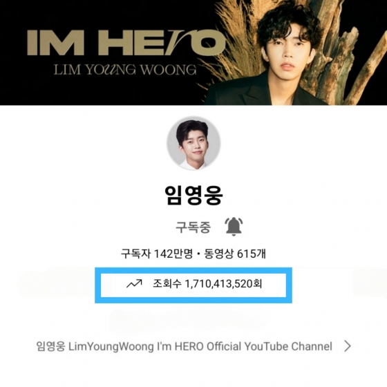 구독자 142만 명의 임영웅 공식 유튜브 채널은 10월 22일 총조회수 17억 1000만 뷰를 넘어섰다. 지난 10월 16일 17억 뷰 대기록 달성 후 5일 만에 또 새로운 기록을 쓰며 인기를 빛냈다.