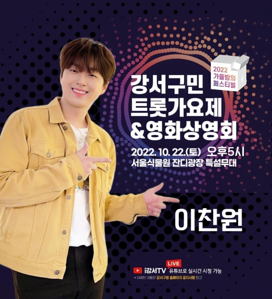 이찬원은 10월 22일 오후 5시 서울 강서구 마곡동로 서울식물원 잔디광장 특설무대에서 열리는 '강서구민 트롯 가요제&영화상영회' 특별무대에 오를 예정이다.