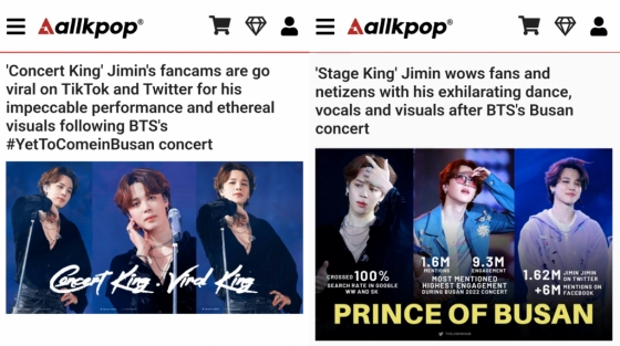 실시간으로 업로드되는 지민의 콘서트 영상 또한 수백만 조회수와 '좋아요'를 자랑하며 방탄소년단의 퍼포먼스를 이끄는 메인 댄서이자 메인 캐릭터로서의 인기를 증명, 틱톡에서의 지민 팬캠은 이번 부산 콘서트 관련 최다 조회수를 기록하기도 했다.