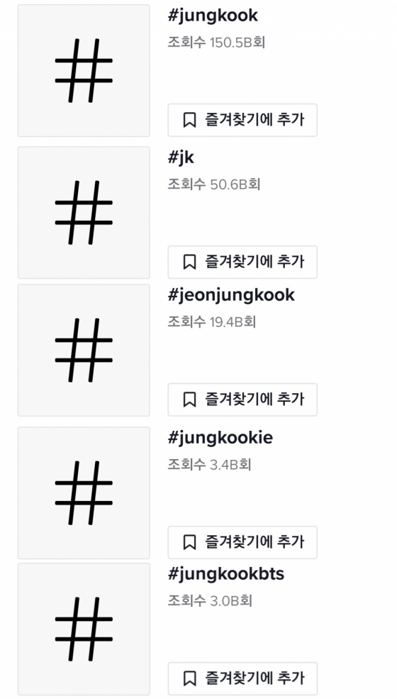 틱톡에서 정국과 관련된 상위 톱5 해시태그의 총 조회수만 2323억에 달했다.