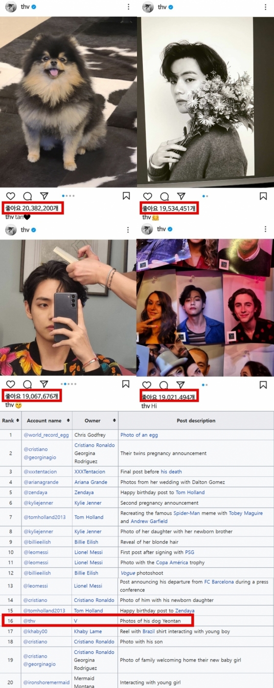 1900만 '좋아요'를 기록한 4개의 게시물은 세계에서 가장 유명한 셀럽의 반려견 연탄, 뷔가 꽃을 들고 있는 사진, 홍보모델로 활동하고 있는 삼성 갤럭시로 찍은 셀카, 코든쇼 사진 등이다.