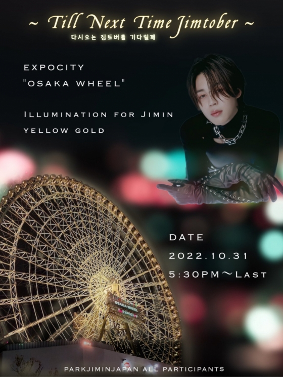 지민의 일본 팬 베이스 'PARKJIMIN JAPAN'은 SNS를 통해 2022년 지민의 생일(10월 13일) 마지막 축하와 감사를 담고 내년 'JIMTOBER'를 기약하며 오는 31일 오후 5시 30분부터 10시까지 일본 내 최고 높이를 자랑하는 오사카의 대관람차를 노란색 조명으로 점등한다.