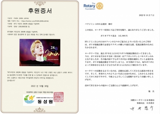 이와 더불어 지민의 생일을 맞아 지민의 고향인 부산의 사회복지법인 '동성원'과 '세계 소아마비 날'을 맞아 국제 로터리 클럽에 지민의 이름으로 기부금을 기탁해 훈훈한 감동까지 더하며 지민을 향한 특별한 사랑을 전했다.