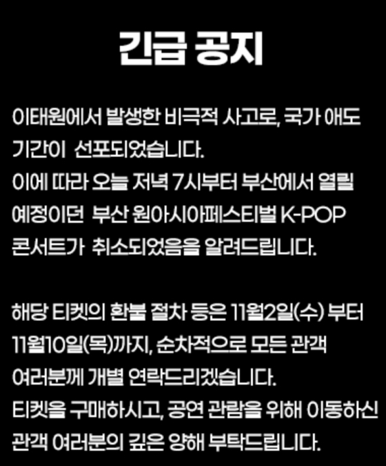 부산원아시아페스티벌은 30일 공지를 통해 "이태원에서 발생한 비극적 사고로 국가 애도기간이 선포됐다"라며 "이에 따라 오늘 저녁 7시부터 부산에서 열릴 예정이었던 부산 원아시아페스티벌 K-POP 콘서트가 취소됐다"라고 알렸다.