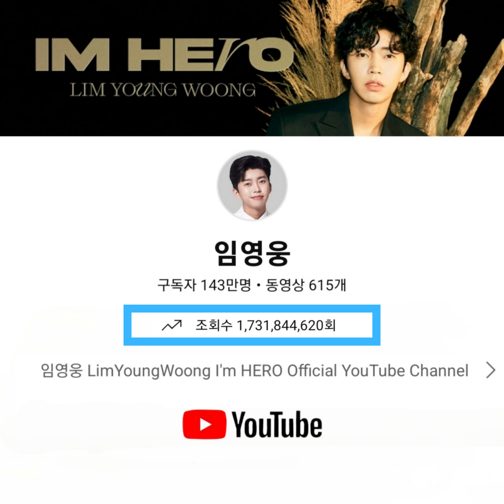 구독자 143만 명의 임영웅 공식 유튜브 채널은 11월 5일 총조회수 17억 3000만 뷰를 넘어섰다. 지난 3일 17억 2000만 뷰 달성 후 이틀 만에 1000만 뷰가 증가하며 새로운 기록을 썼다.