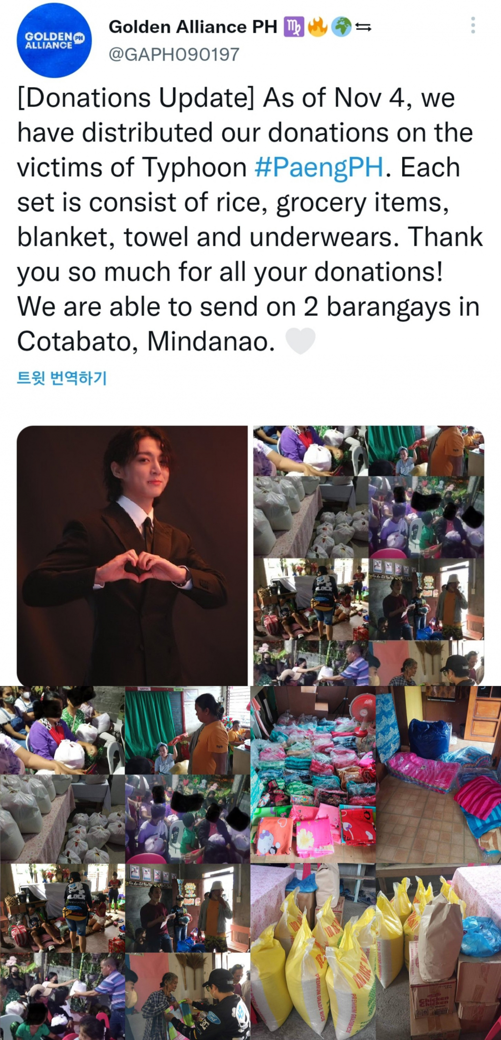 정국의 필리핀 팬 베이스 '골든 얼라이언스 필리핀'(Golden Alliance PH)은 태풍 '날개'로 피해를 입은 필리핀 남부 지역에 따뜻한 온정의 손실을 나눴다.