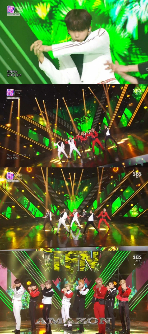 TFN은 지난 6일 오후 방송된 SBS '인기가요'에 출연해 미니앨범 'BEFORE SUNRISE(비포 선라이즈 파트 4)'의 타이틀곡 'AMAZON(아마존)' 무대를 펼쳤다. 이날 TFN은 중독성 강한 멜로디에 맞춰 풀어낸 자유분방함과 절도 있는 퍼포먼스는 TFN만의 파워풀한 매력을 배가시켰다.