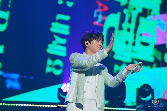 이찬원은 두 번째 사진에서는 민트 색상의 반짝이 재킷에 흰색 바지로 깔끔한 모습을 선보였다. 이찬원은 마이크를 들고 환하게 웃으며 팬들에게 박수를 유도하고 있다.