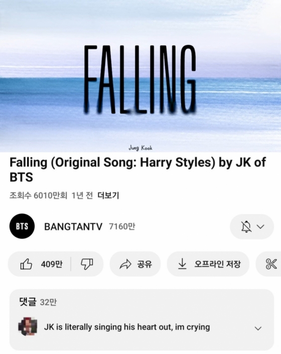 정국이 지난해 10월 28일 방탄소년단 공식 유튜브 채널 '방탄TV'(BANGTANTV)에 공개한 'Falling'(폴링) 커버 오디오 영상은 최근 6000만뷰를 넘어섰다.