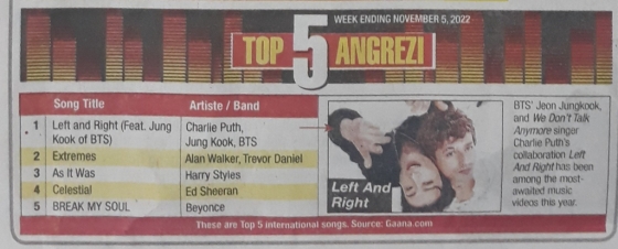 1위 'Left and Right'에 이어 2위로는 알렌워커(Alan Walker)X트레버 다니엘(Trevor Daniel)의 Extremes, 3위는 해리 스타일스(Harry Styles)의 As It Was, 4위는 에드 시런(Ed Sheeran)의 Celestial, 5위는 비욘세(Beyonce)의 Break My Soul 등이 인도에서 가장 인기 있는 인터내셔널 송 톱 5에 각각 이름을 올렸다.