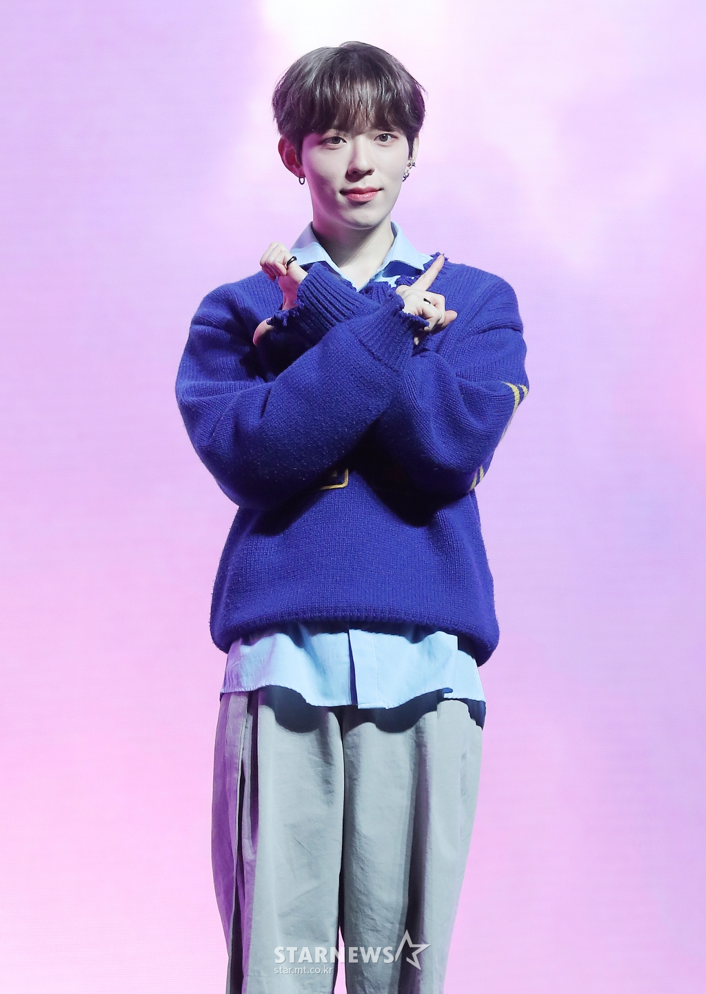그룹 나인아이 이든이 8일 오전 서울 용산구 한남동 블루스퀘어에서 진행된 두 번째 미니앨범 'I (Part. 1)' 발매기념 쇼케이스에 참석해 포즈를 취하고 있다.