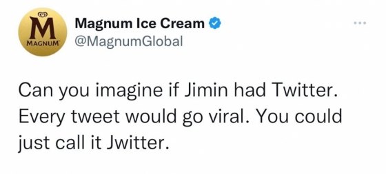 아이스크림 브랜드 매그넘(Magnum)은 최근 공식 트위터를 통해 ''지민이 트위터를 가졌다고 상상해봐. 모든 트윗은 바이럴이 될 것''이라며 ''그냥 Jwitter라고 부르자''라는 글을 게재, 눈길을 끌었다.