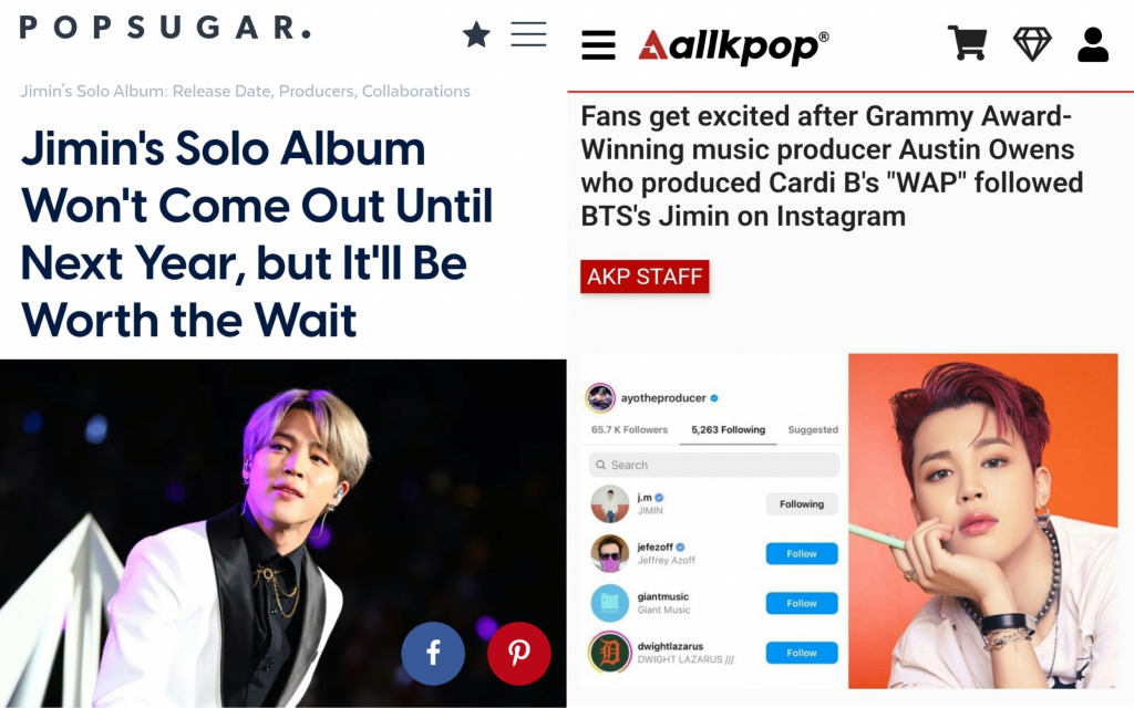 마지막으로 칼리드(Khalid), 드레이크(Drake) 등 유명 팝스타들과의 협업에 대한 바람을 드러낸 한편, 미국 매체 올케이팝(Allkpop)은 카디비(Cardi B)가 부른 'WAP'의 프로듀서 'Ayo The Producer'가 지민의 인스타그램을 팔로우하자 카디비와의 협업에 대한 기대감을 전하기도 했다.