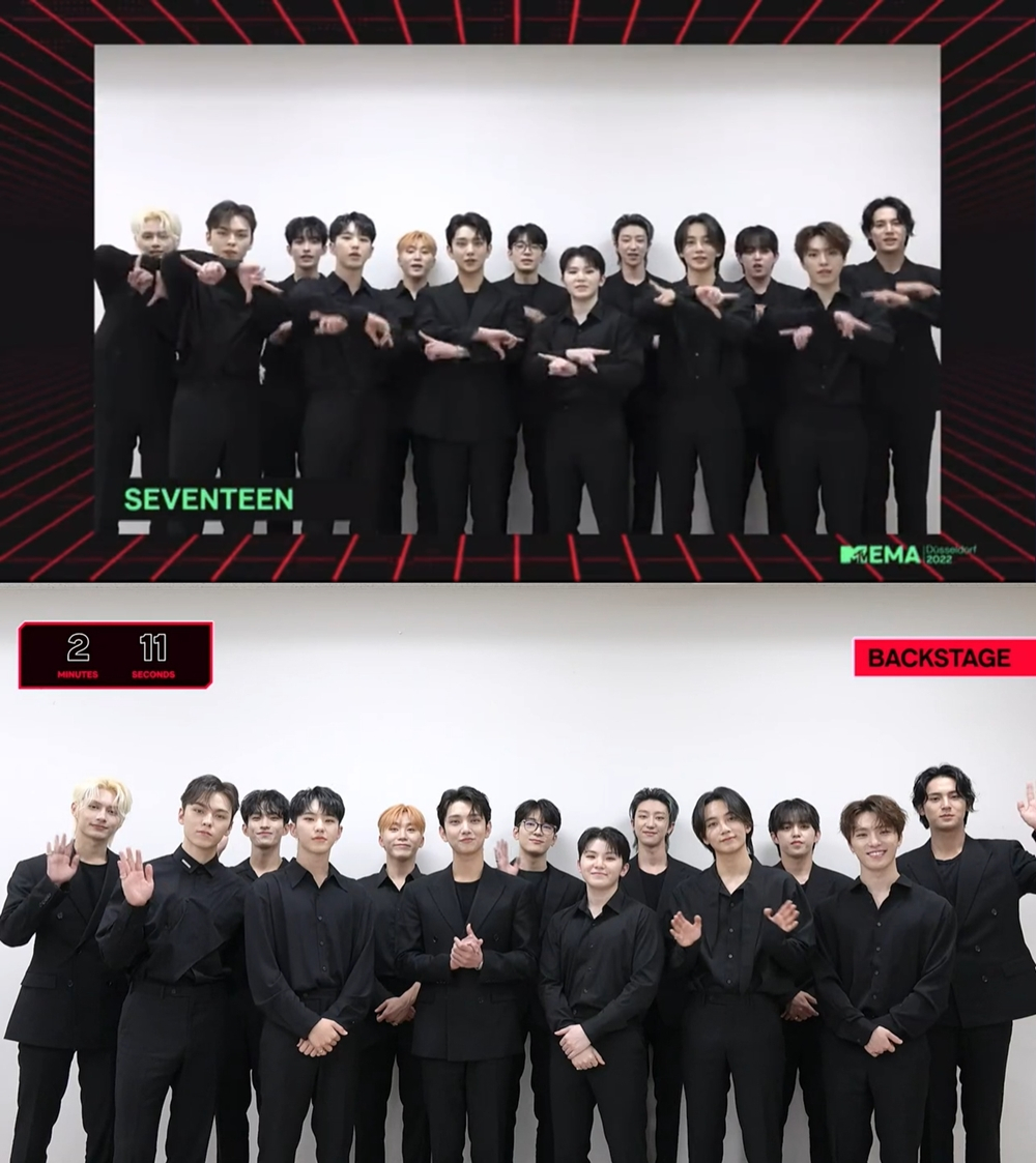 아이돌그룹 세븐틴(에스쿱스 정한 조슈아 준 호시 원우 우지 디에잇 민규 도겸 승관 버논 디노)이 '2022 MTV EMA'에서 첫 수상의 영예를 안았다.