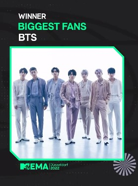 아이돌그룹 방탄소년단과 블랙핑크, 세븐틴, 투모로우바이투게더가 2022 MTV EMA에서 나란히 수상의 기쁨을 안았다.