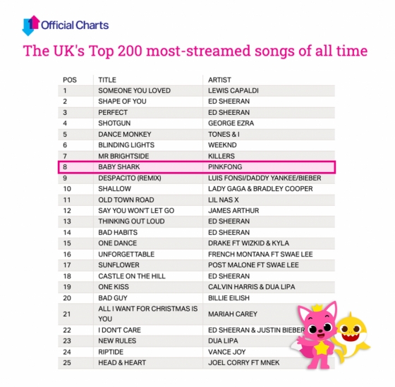 '핑크퐁 아기상어'(Baby Shark)가 영국 오피셜 차트 최다 스트리밍 8위에 등극했다. 빌보드 핫100 차트와 함께 세계 양대 팝 차트로 통하는 영국 오피셜 차트에서 국내 음원이 싱글 10위권을 기록한 것은 핑크퐁 아기상어가 최초이자 유일하다.