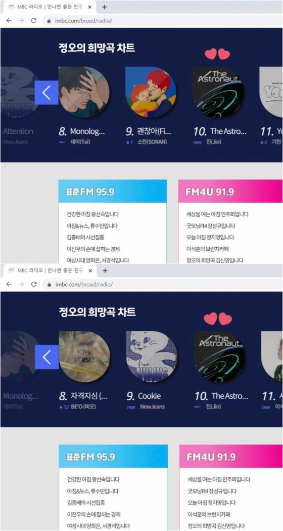 한편 국내 주요 음원차트와 음반판매량 차트, MBC 라디오 방송횟수를 종합한 '정오의 희망곡 차트'에서 진의 'The Astronaut'이 11월 3주차와 4주차 모두 10위에 랭크인해 진의 강력한 음원 파워와 영향력을 입증했다.