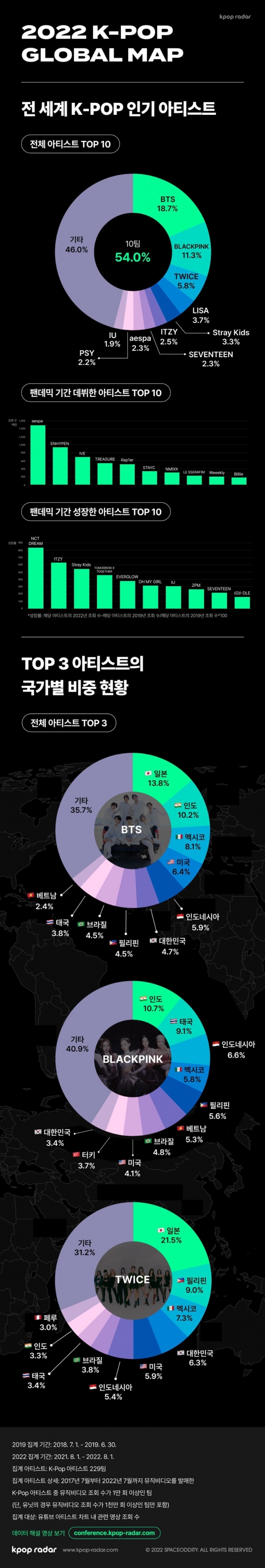 케이팝레이더는 우선 케이팝의 소비량이 팬데믹 기간 동안 2.5배 가량 늘며 폭발적으로 증가했다고 밝혔다. 올 한 해 동안 643억뷰 이상의 유튜브 조회수를 기록했으며 이 가운데 가장 많은 인기를 얻은 아티스트는 1위 BTS(방탄소년단)로 무려 18.7%를 차지했다.
