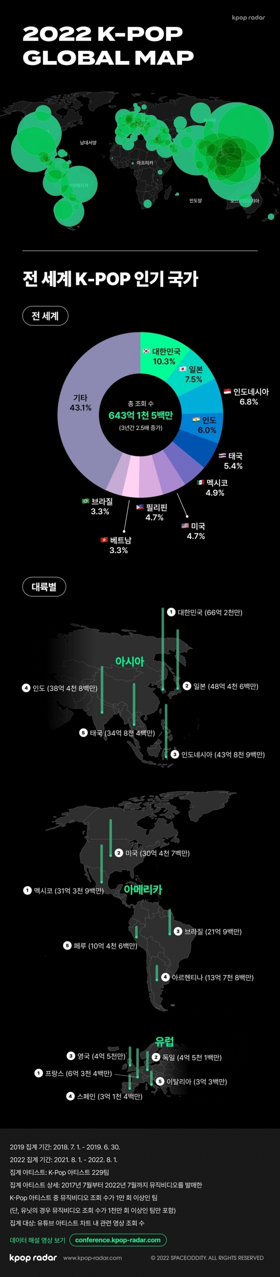 2022 케이팝 세계지도'는 케이팝레이더가 지난 2019년 최초로 데이터를 기반으로 발표하며 화제를 모은 '2019 케이팝 세계지도'의 업데이트 버전으로, 코로나 바이러스 감염증(코로나19) 팬데믹이 시작되고 3년이 지난 후 케이팝의 지형도가 어떻게 바뀌었는지에 대한 내용을 담고 있다.