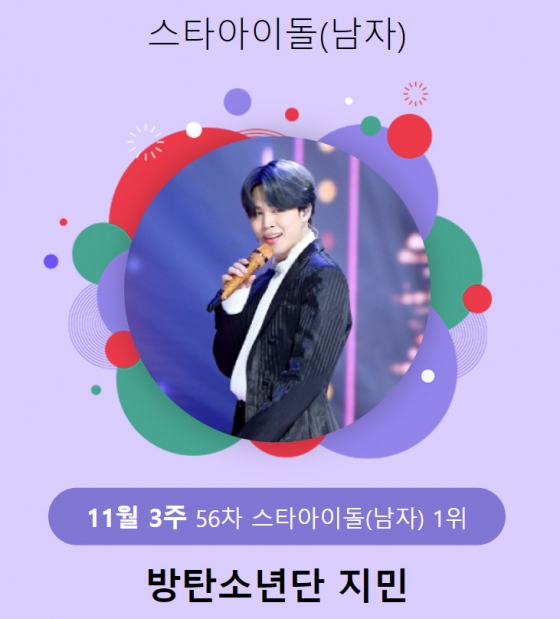 지민은 11월 17일 오후 3시 1분부터 11월 24일 오후 3시까지 진행된 스타랭킹 남자 아이돌 56차(11월 3주) 투표에서 3만 6318표로 1위를 차지했다. 이로써 지민은 56주 연속 1위를 차지하며 글로벌한 인기를 자랑했다.