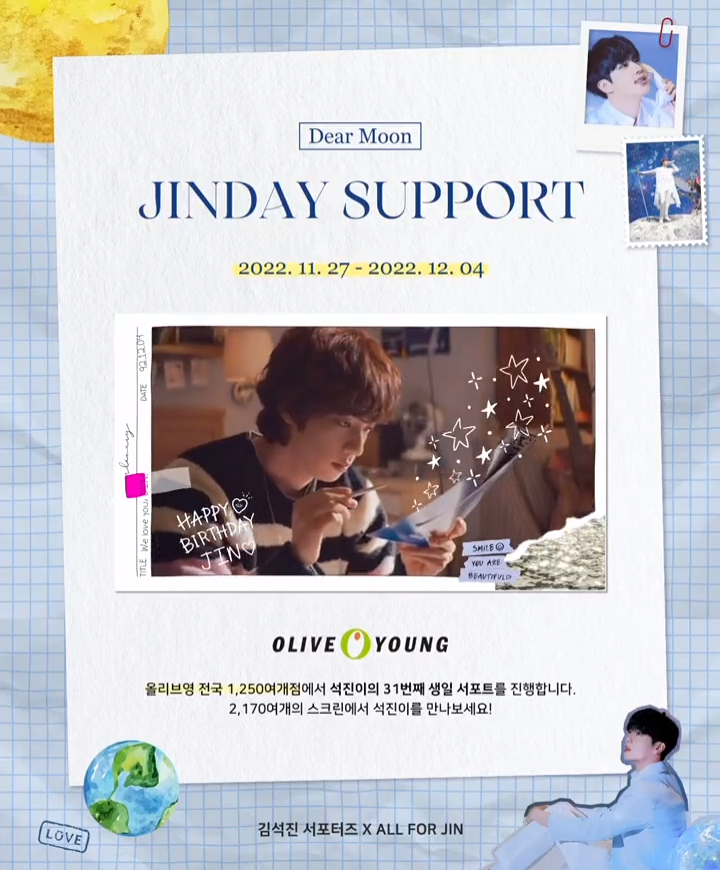 또다른 팬서포트인 '김석진 서포터즈'는 '올포진'과 함께 진의 생일을 맞아 전국 1250여개 올리브영 매장에 11월 27일부터 12월 4일까지 일주일간 스크린 영상 광고를 송출할 예정이다.