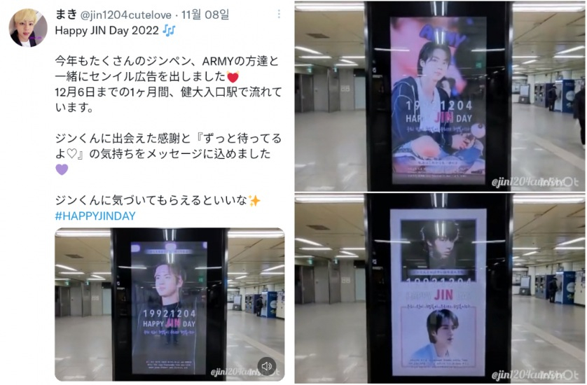 진의 일본 팬계정인 '마키'(まき)는 일본의 많은 아미들과 함께 진의 생일을 축하하기위해 11월 21일 부터 12월 6일까지 건대입구역 CM보드 광고를 송출한다.