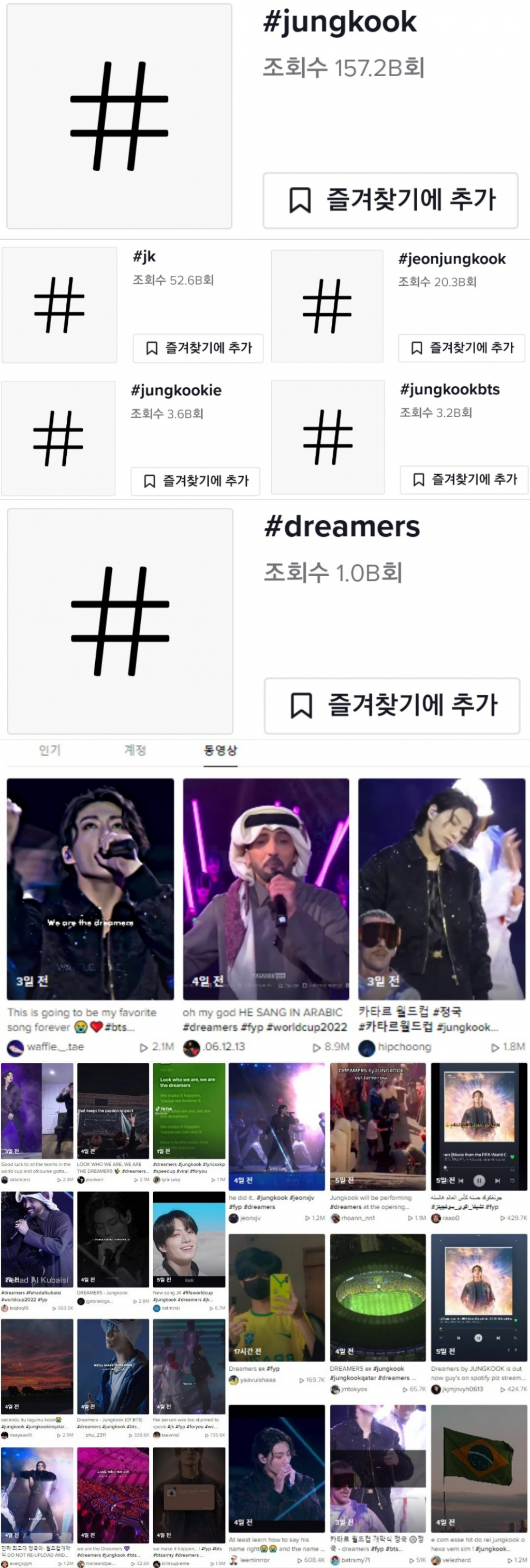 이와 함께 정국이 지난 20일 발매한 월드컵 공식 사운드 트랙 'Dreamers(드리머스)'도 틱톡에서 인기 실세로 떠올랐다.