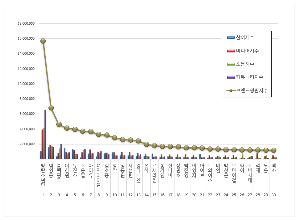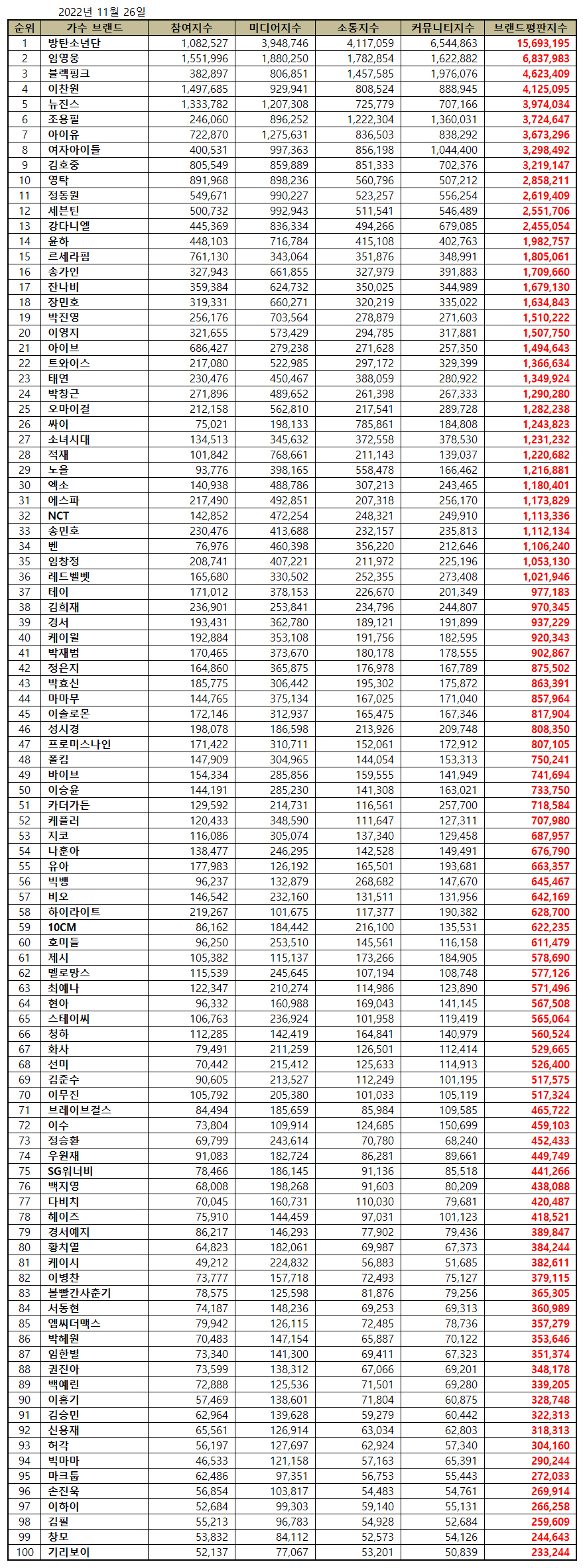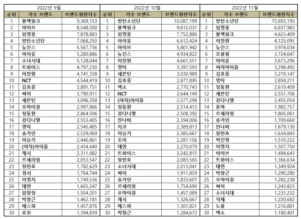 2022년 11월 가수 브랜드평판 30위 순위는 방탄소년단, 임영웅, 블랙핑크, 이찬원, 뉴진스, 조용필, 아이유, 여자아이들, 김호중, 영탁, 정동원, 세븐틴, 강다니엘, 윤하, 르세라핌, 송가인, 잔나비, 장민호, 박진영, 이영지, 아이브, 트와이스, 태연, 박창근, 오마이걸, 싸이, 소녀시대, 적재, 노을, 엑소 순으로 분석됐다.