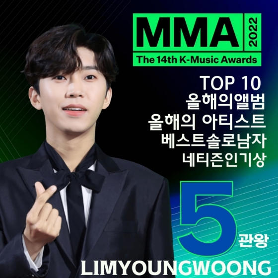 임영웅은 지난 26일 서울 고척스카이돔에서 열린 MMA2022에서 본상인 TOP10을 비롯해 베스트 남자 솔로, 네티즌 인기상, 올해의 아티스트, 올해의 앨범 등 5개의 트로피를 거머쥐었다.