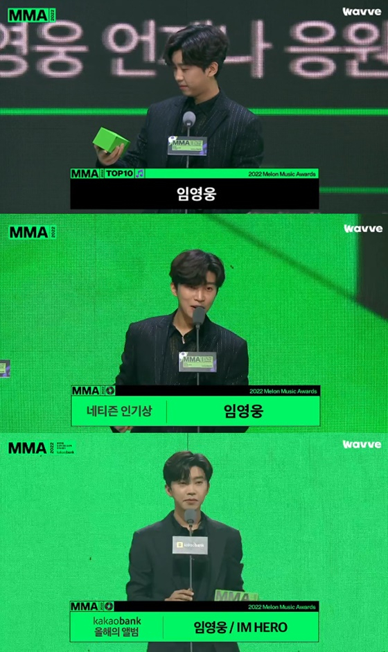 이날 수상자 중 최다관왕에 오른 임영웅은 대상 부문에서만 올해의 앨범, 올해의 아티스트 등 2개의 트로피를 거머쥐었다.