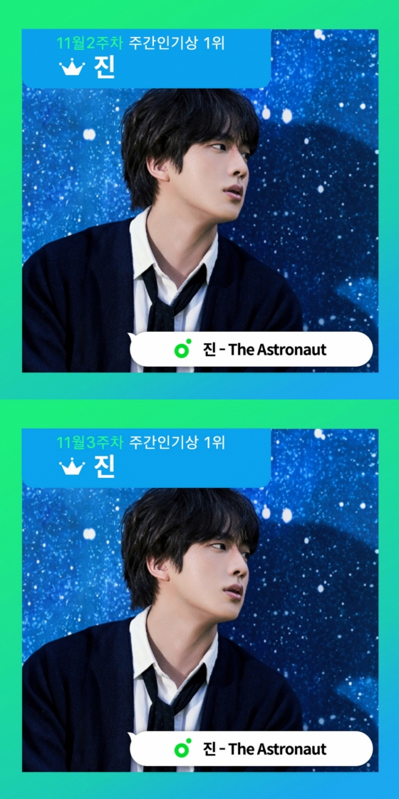 지난 28일 국내 주요 음원 플랫폼 멜론(melon)은 공식 트위터 계정을 통해 "11월 3주차 '멜론 주간인기상' 트로피 도착. 띵동 - 아티스트에게 전달될 #주간인기상 트로피가 도착했어요!", "트로피의 주인공은 연속 수상에 빛나는 #진 의 #The_Astronaut. 트로피는 아티스트에게 직접 전달됩니다"라는 문구와 함께 진의 주간인기상 트로피 사진을 공개했다.