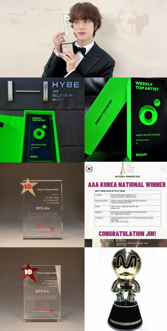 진은 이외에도 '2022 TMA 팬앤스타 초이스상 개인부문 1위', 'TTA, the Best Artist of K-Drama OST in the World', ''TTA, the Best Artist of K-Drama OST in Mexico', 'AACA, Best Theme Song or Title Theme National Winner', 'Mnet 엠 카운트다운 1위' 등 여러 개인상을 수상하며 글로벌 최강 인기와 영향력을 증명했다.