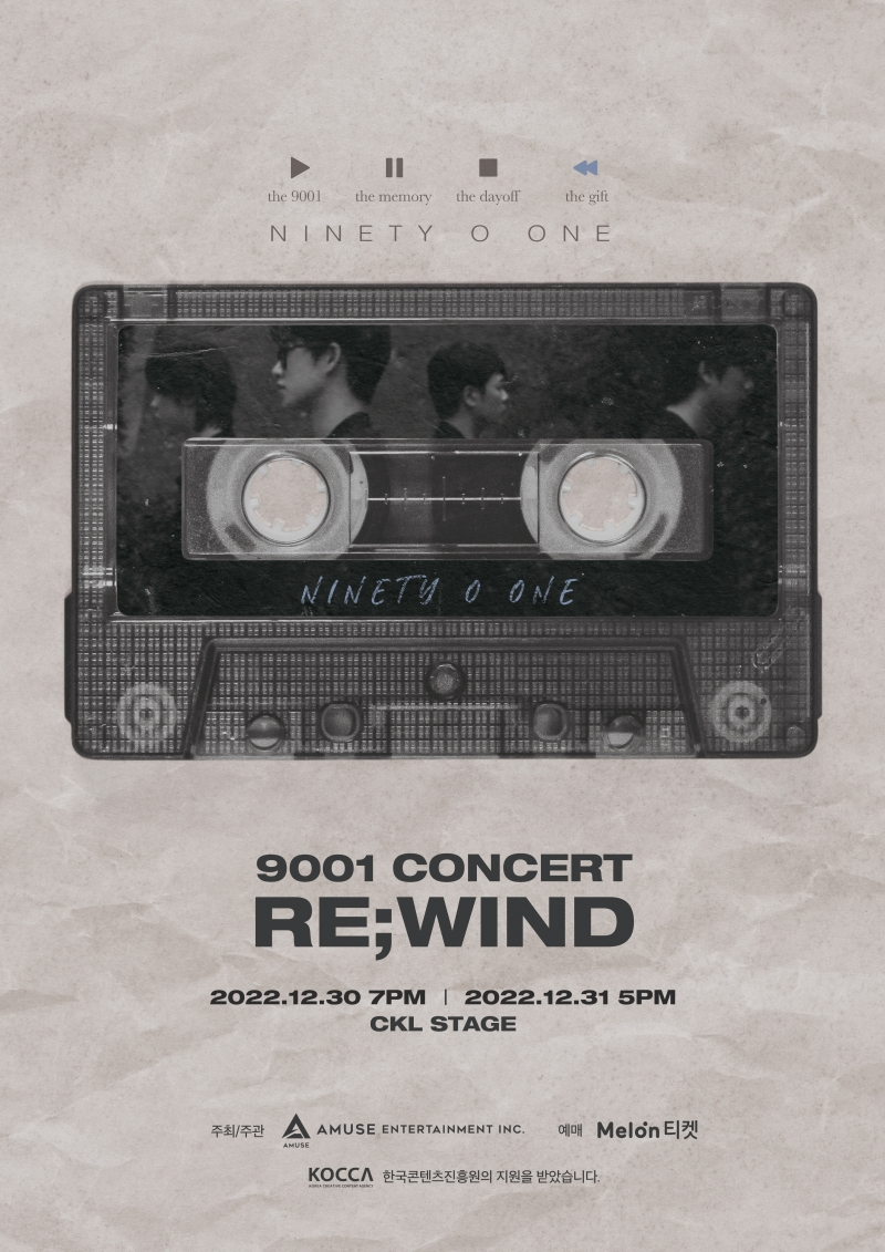 이번 콘서트는 한국콘텐츠진흥원의 지원을 받아 제작된 공연. 공지에 따르면 9001은 오는 12월 30일과 31일 양일간 서울 중구에 위치한 CKL스테이지에서 연말 콘서트 '리와인드'를 개최하고 팬들과 만난다.
