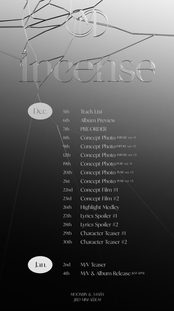 지난 2일 오후 7시 소속사 판타지오의 공식 SNS를 통해 공개된 'INCENSE' 스케줄러에 따르면, 문빈&산하는 트랙리스트, 앨범 프리뷰, 'IMPURE'(임퓨어)와 'PURE'(퓨어) 버전 콘셉트 포토, 콘셉트 필름, 하이라이트 메들리, 리릭 스포일러, 캐릭터 티저까지 다양한 티징 콘텐츠를 순차적으로 공개할 예정이다.
