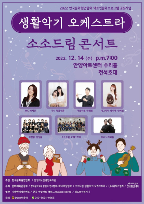 공연 공동 주최사 '소소한 음악' 관계자는 "지난 6월부터 6개월 간 안양시노인종합복지관에서 악기를 배우고 아름다운 하모니를 만들어냈고 이번 콘서트를 통해 감상할 수 있다"고 전했다.