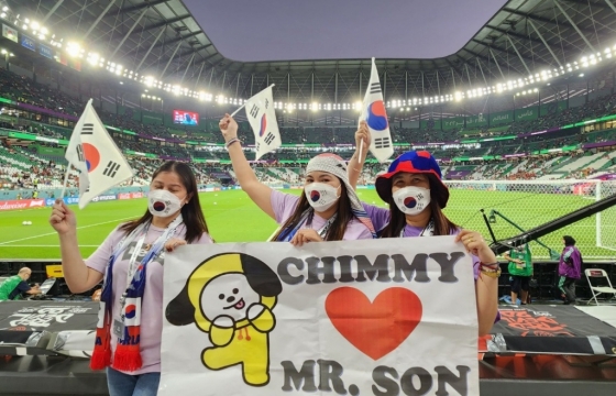지난 3일 열린 2022 FIFA 카타르 월드컵 16강 진출 결정전 대한민국 대 포르투갈 경기 중 비춰진 관중석에서 붉은악마들 사이 지민의 캐릭터 '치미'가 그려진 플래카드로 응원에 나선 모습이 여러 방송사를 통해 중계됐다.