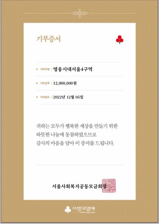 임영웅 팬클럽 영웅시대 서울4구역(성북,강북,도봉,노원,중랑)은 12월 5일 중랑구(구청자 류경기)를 통해 히어로건행 장학금 1200만 원을 취약계층 청소년을 위해 서울사회복지공동모금회에 기탁했다.