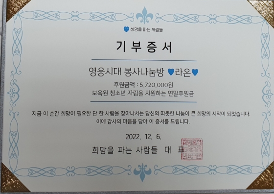 영웅시대 봉사나눔방 '라온'은 "성탄절을 맞아 '희망을파는사람들'을 통해 희망이 필요한 청소년들을 위한 후원금 572만원을 전달했다"고 밝혔다. 후원금은 보육원을 나서는 청소년 자립 지원에 쓰일 예정이다.